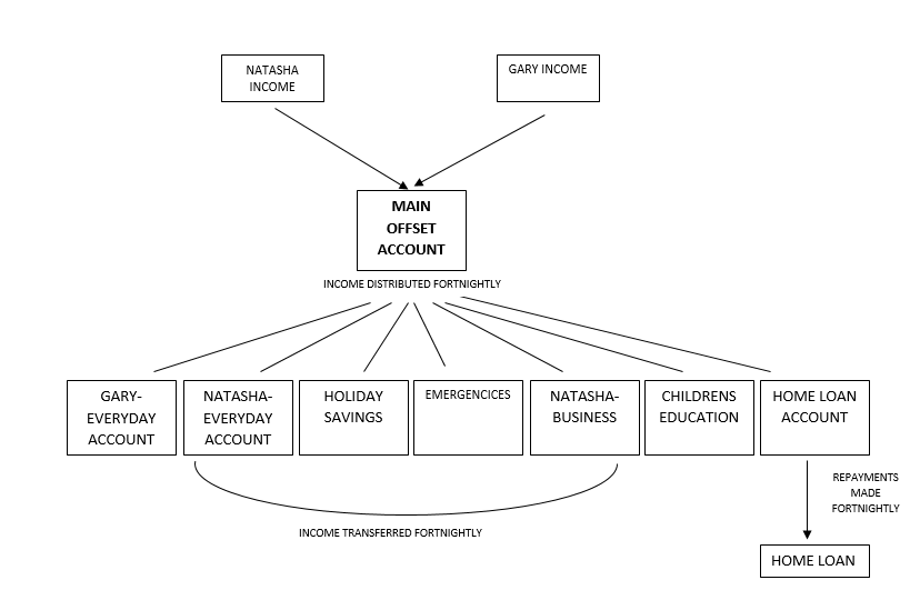 Gary and Natasha under their new structure use MULTIPLE OFFSET accounts to budget for the family holiday, emergencies and keep Natasha’s business funds in a separate account. Their banking structure looks something like this: